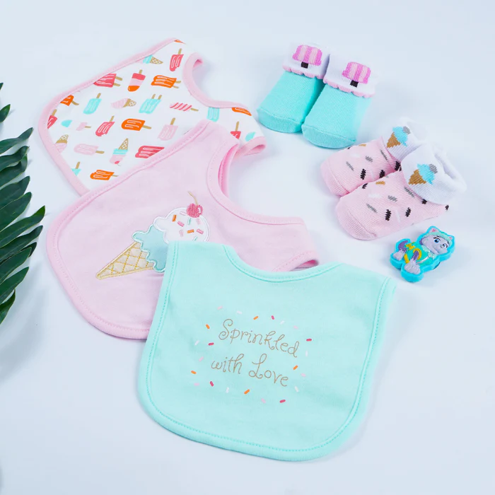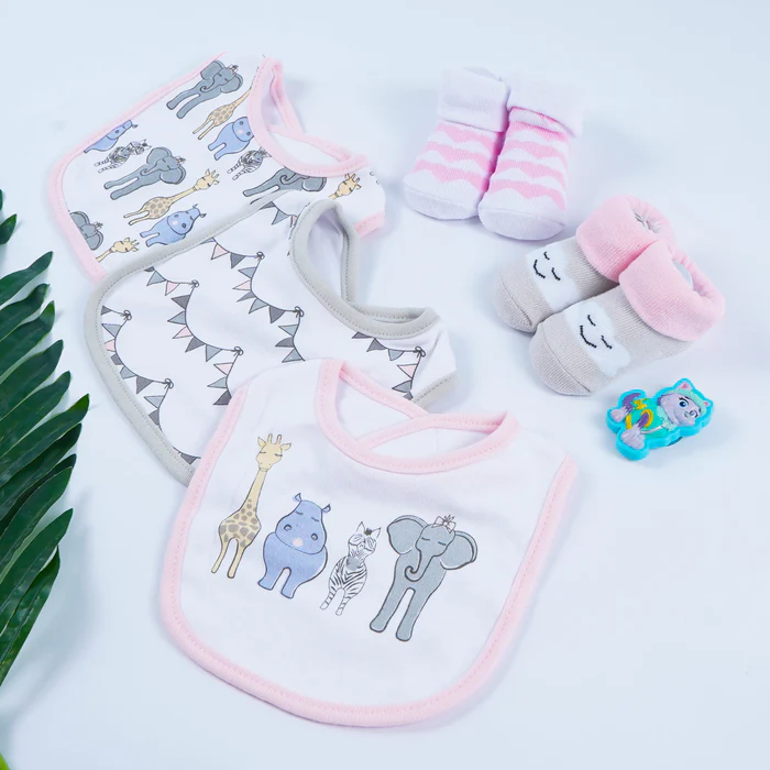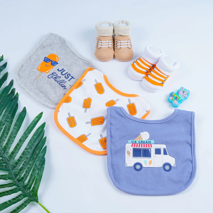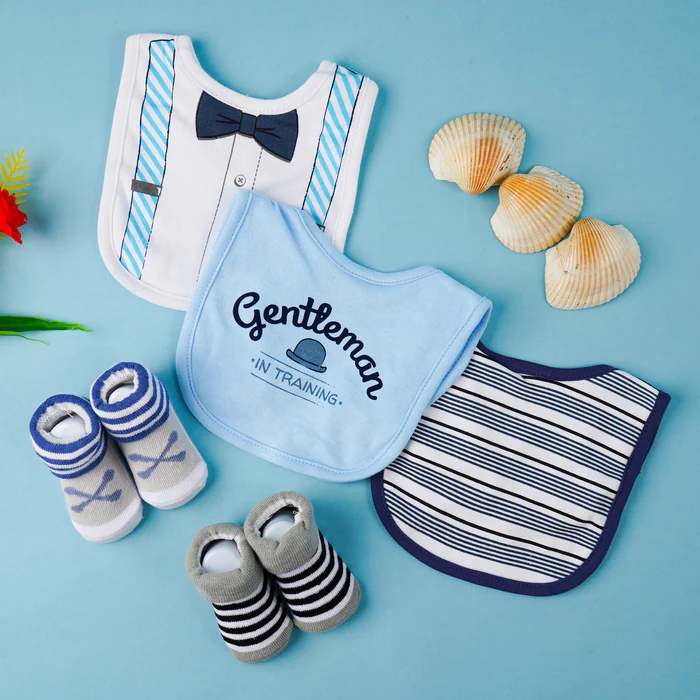 Baby Bibs & Booties Set Little Dude White & Grey is a practical pick for everyday mess-free moments and cute photos. This set includes 3 x Bibs & 2 x Pairs of Booties. Three rounded bibs with checks, stripes, and bow accents pair with two soft booties for easy mixing. Gentle edges, absorbent layers, and stretchy bootie cuffs keep outfits clean and feet comfy during mealtimes and outings. Crafted with gentle fabrics and thoughtful finishing, it’s easy to wear, simple to wash, and comfy all day.