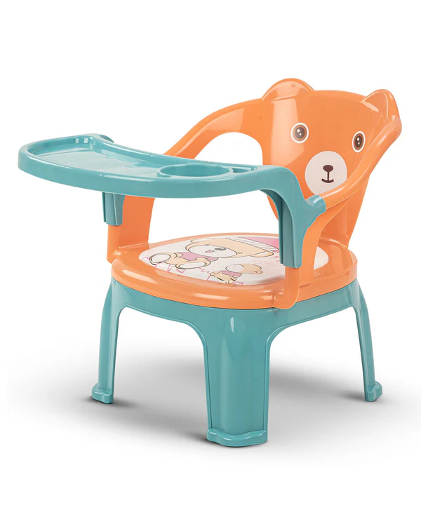 Baby Feeding Chair Bear Orange & Green is a booster seat for mealtime and play. This set includes 1 x Feeding Chair, 1 x Detachable Tray. Crafted from sturdy, non?toxic plastic, this chair has a smooth seat decal, protective rounded edges, and a swing?away tray with cup space; the wide legs add stability while the easy?clean finish keeps cleanup quick. Designed to be portable and space?saving, it sets up anywhere at home. The smooth edges feel gentle for little hands.