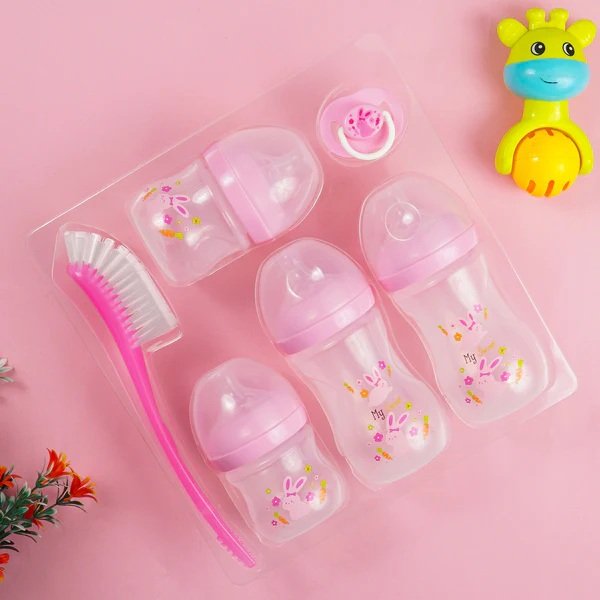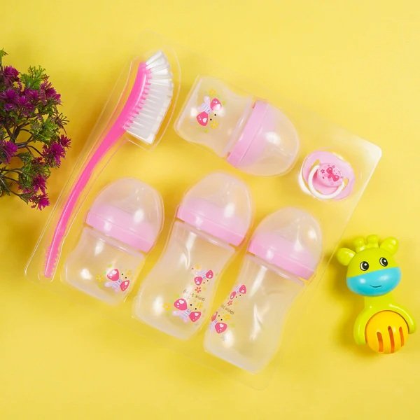 6-Piece Set. Baby Newborn Starter Feeding Set in Blue Color – made from BPA-free materials, the set includes four different size feeding bottles with gentle silicone teats that are easy on your baby’s gums and simple to clean. It also comes with a natural brush for effective cleaning of feeders. Additionally, a soft pacifier to soothe your baby from teething discomfort.