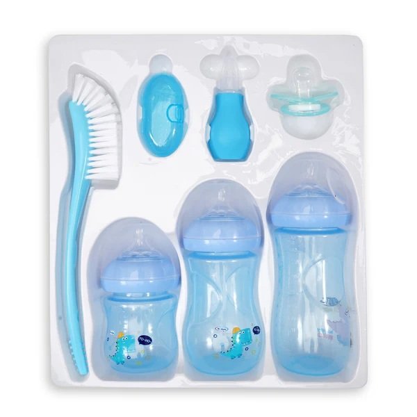 7-Piece Set. Baby Newborn Starter Feeding Set in Blue Color – made from BPA-free materials, the set includes three different size feeding bottles with gentle silicone teats that are easy on your baby’s gums and simple to clean. It also comes with a natural brush for effective cleaning of feeders, a finger toothbrush for maintaining your baby’s oral hygiene, and a nose aspirator to gently clear nasal passages. Additionally, the set includes a pacifier to soothe your baby from teething discomfort.